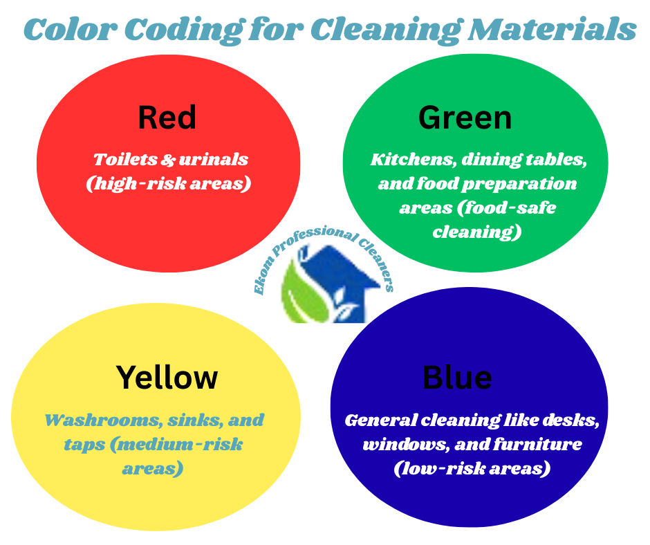 • πŸ”΅ Blue – General cleaning like desks, windows, and furniture (low-risk areas)